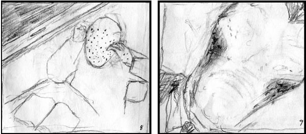 | The kind of stigmas that a kid gets from scratching at his chicken pox too much. | His cheekbones stick way out and that drearily sagging, divotted skin draping down over them makes two shadowy holes like twin mountain caves. | |||
