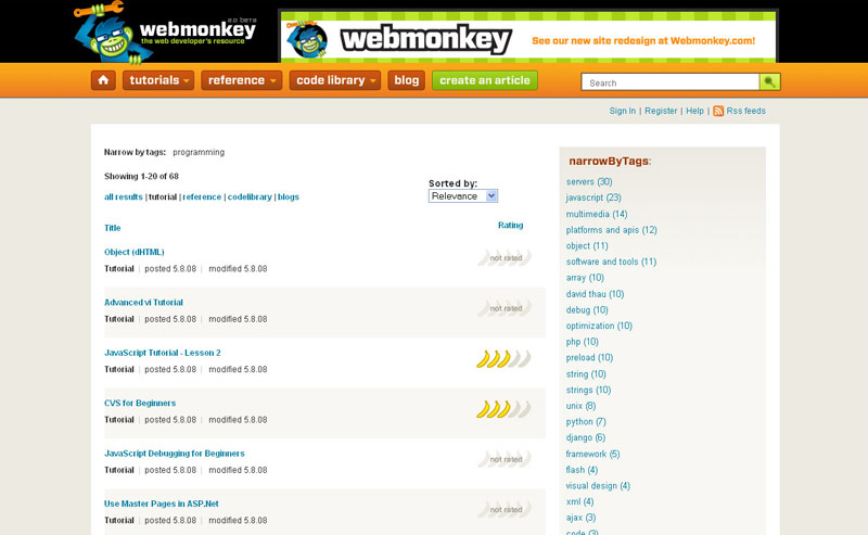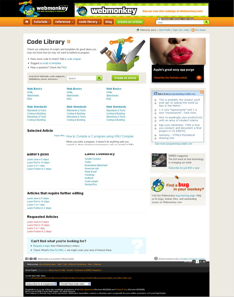 This was a pretty cool project, technologically. 'Twas a bear, though - months of late, late nights. We put mediawiki on top of a java platform, sitemesh, yui library, etc... In addition to being a bear to get all of these technologies (some of them fairly new) to work together, it turned out to be a big time suck for the editorial staff in terms of managing spam. So they turned it into a blog after about a year, but after I saw that conde had made the switch, I managed to grab some screenshots (for some sort of posterity) from the staging server, which hadn't been decommisioned yet...